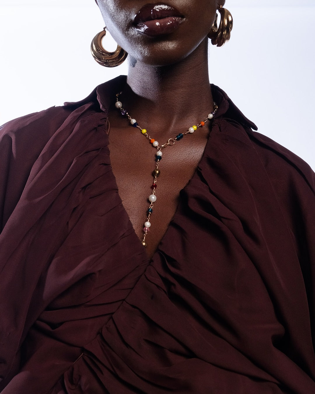 Model 1 in chocolate is wearing the blouse in XL and the Tara lace skirt in a custom size