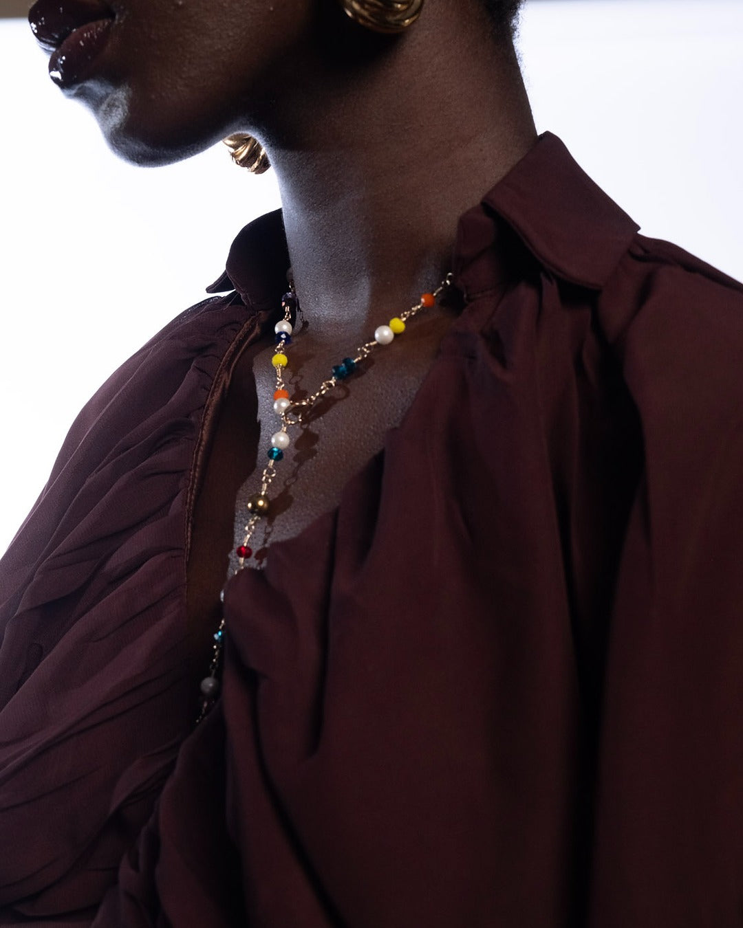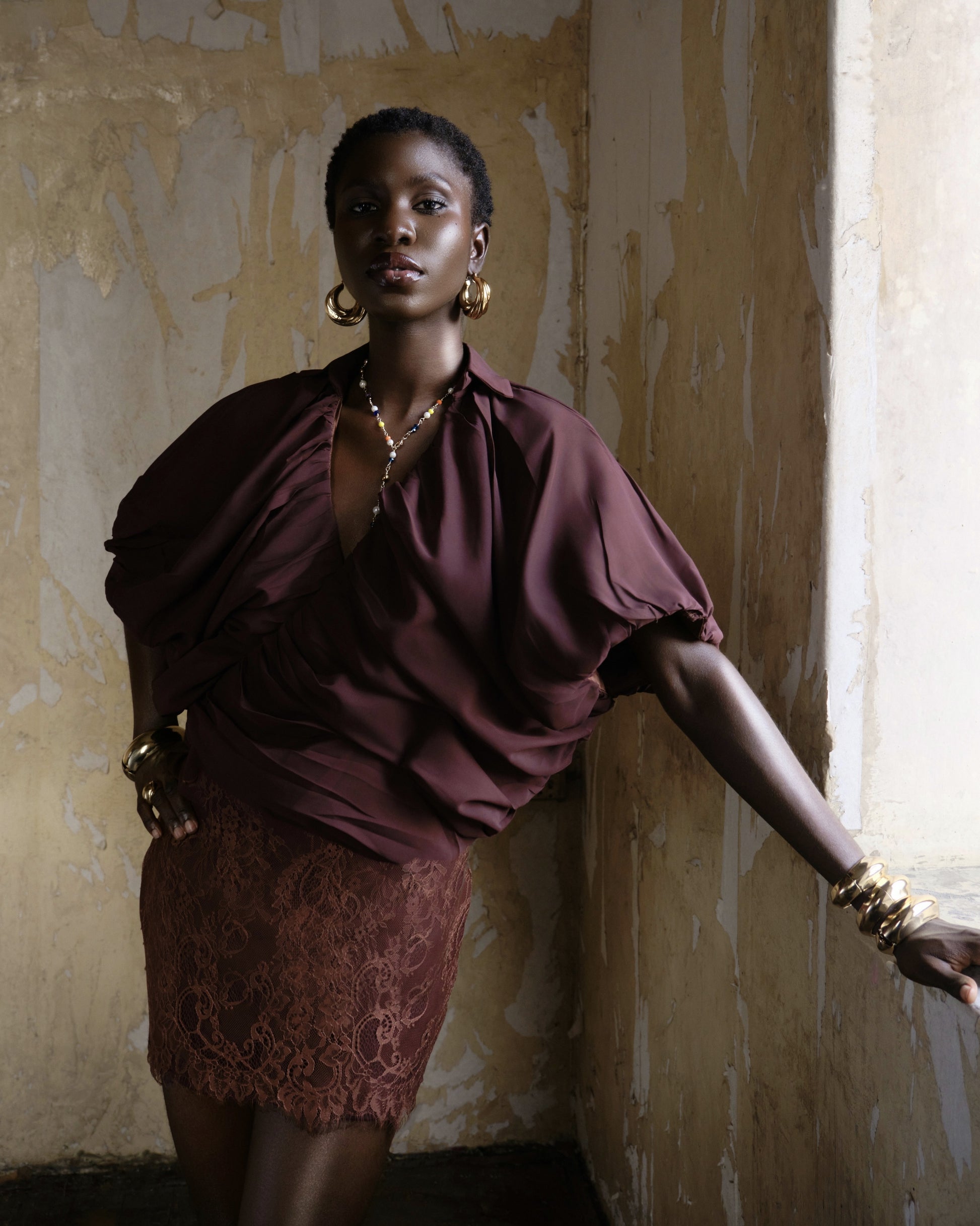 Model 2 in chocolate is wearing the blouse in S and the Tara lace skirt in a UK size 6